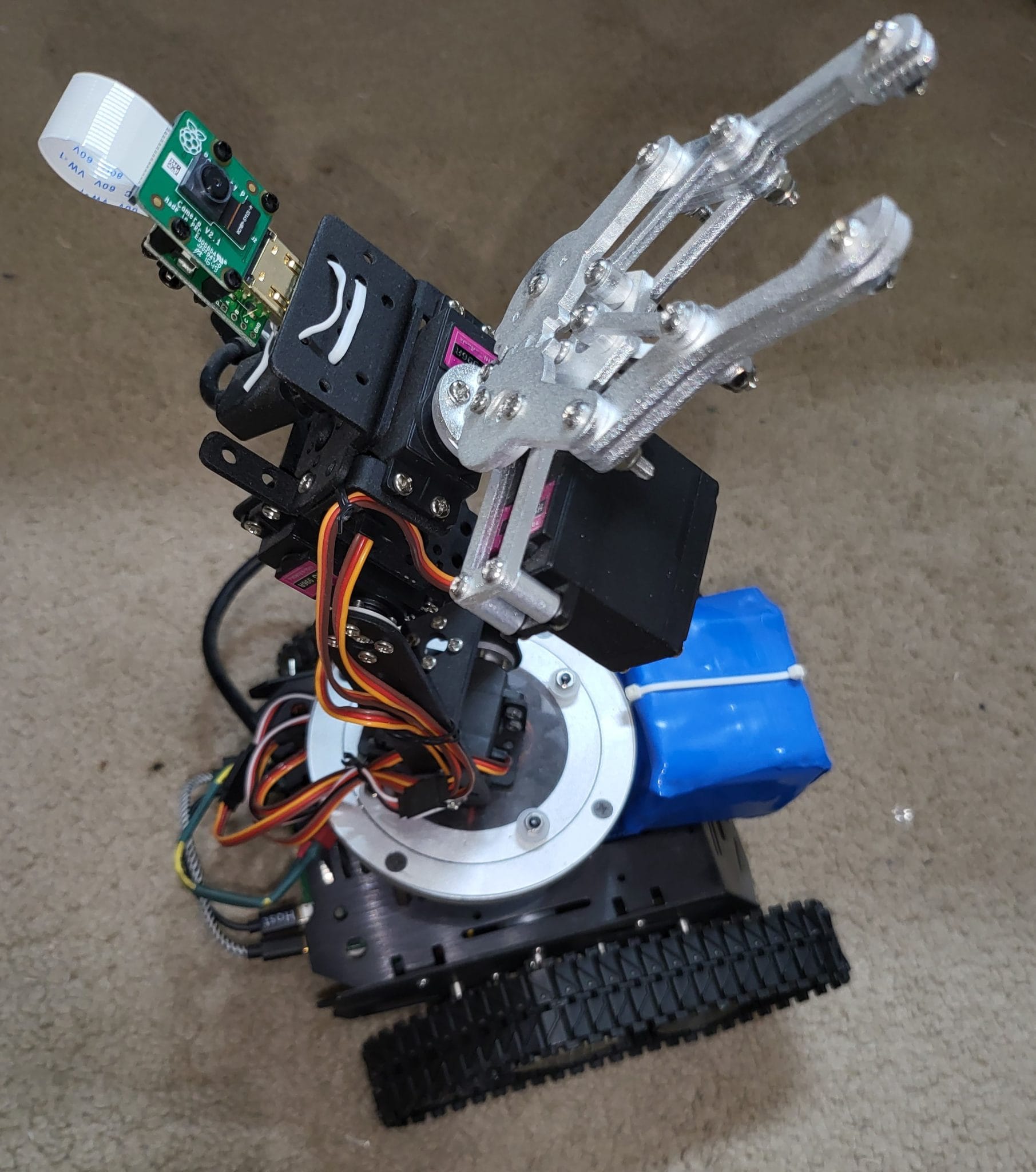 Not being a kit, this monster required me to research how to control motors and servos with a Raspberry Pi and adapt some existing software to control movement of the tank and arm simultaneously. Not a work of art by any means but was exciting to make it work and control to interact with things. I mean, have it drive across the room and get the remote and bring it back. Took 4 times as long but was way more fun. :)