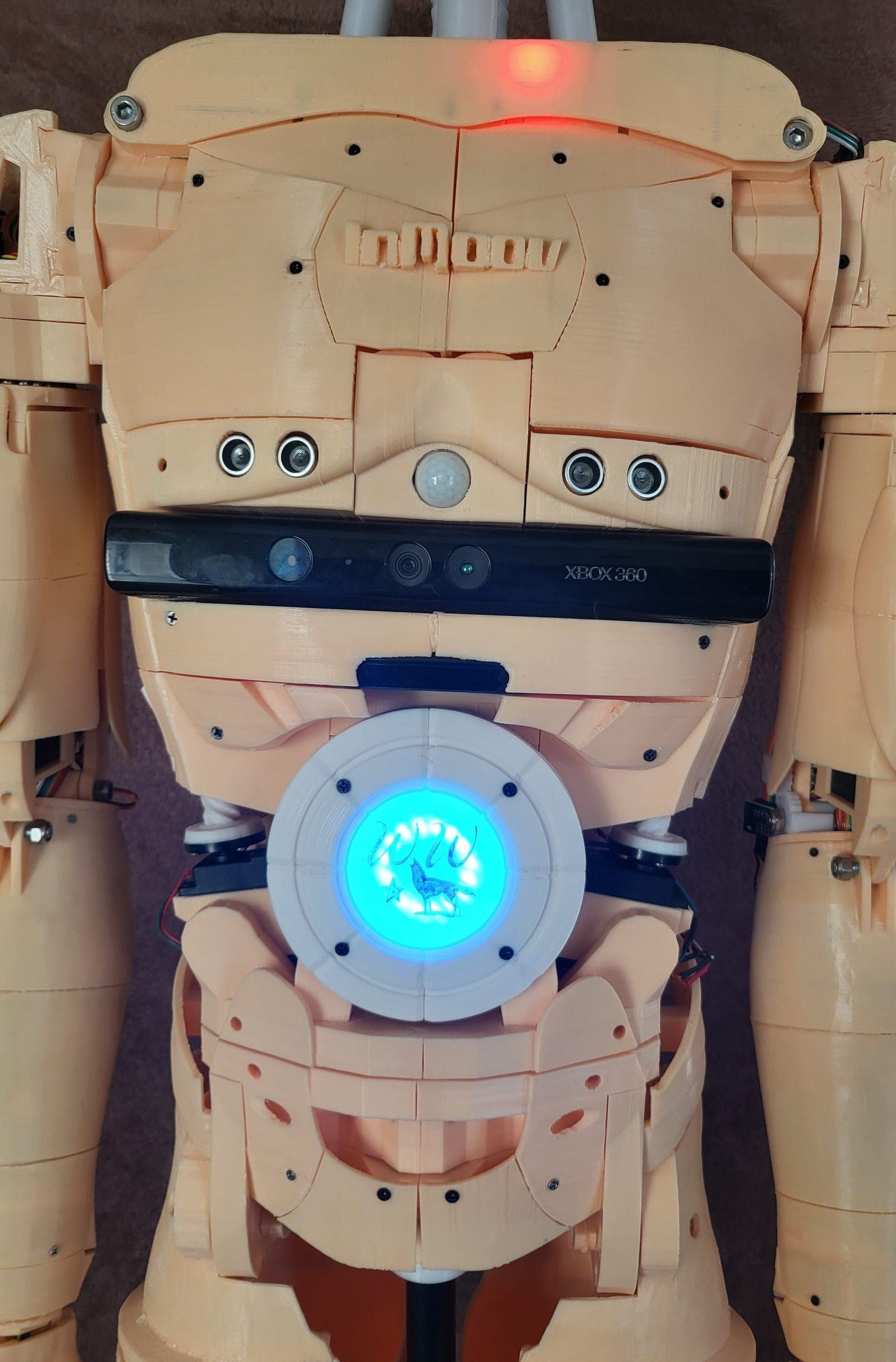 For Bob's chest and torso, he can rotate left to right and lean side to side. He has two HC-SR04 distance sensors and a HC-SR501 PIR infrared motion sensor. He also currently has a Microsoft Xbox 360 Kinect module but it is not designated to any function (maybe someday). Bob has two LED systems; One is a 32 LED strip and the other is a 16 LED ring.